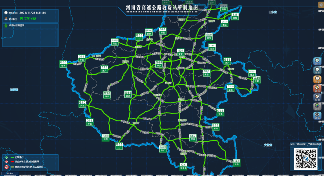 发布时间:2021年11月24日08:35省高速公路路警联合指挥中 省内高速公路通行顺畅。施工路段:1.京港澳高速(G4)确山服务区封闭施工。(施工时间:2020年6月1日-2021年12月31日) 2.京港澳高速(G4)新乡服务区封闭施 ...