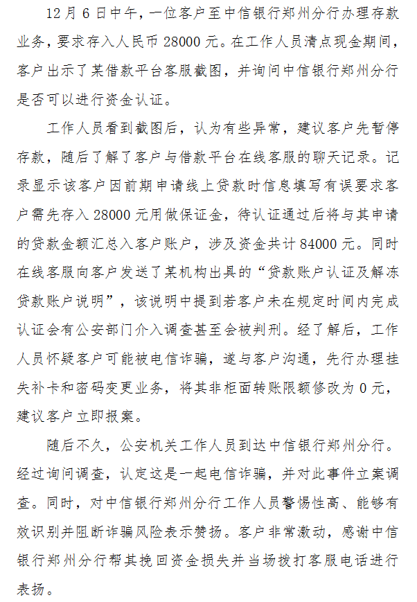 中信银行郑州分行协助客户识别诈骗 挽回资金损失 ...