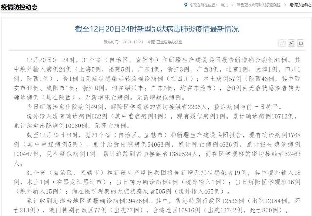 12月20日0—24时,31个省(自治区、直辖市)和新疆生产建设兵团报告新增确诊病例81例。其中境外输入病例24例(上海5例,福建5例,广东4例,浙江3例,广西3例,北京1例,天津1例,四川1例,陕西1例),含1例由无症 ...