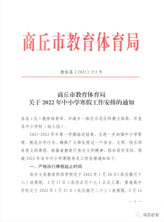 近日商丘市教育体育局公布2022年中小学寒假工作时间↓↓↓义务教育阶段学校定于2022年1月20日(农历腊月十八)放寒假2月17日(农历正月十七)正式上课普通高中学校定于2022年1月25日(农历腊月二十三)放寒假2月16日 ...