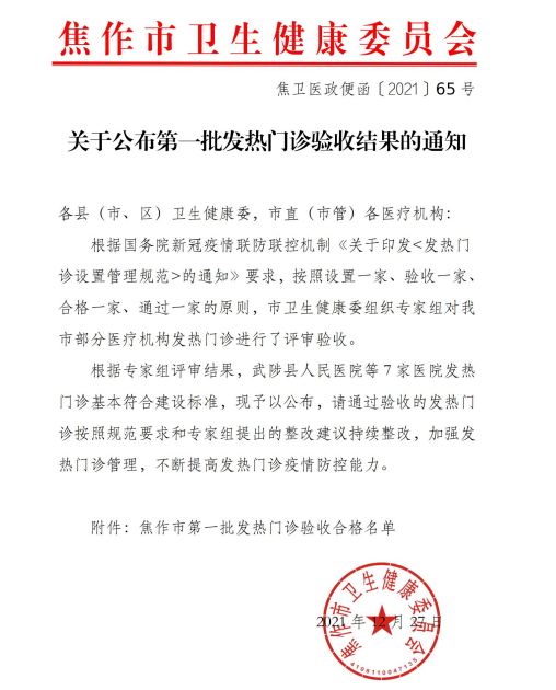 近日,焦作市卫健委组织专家对我院发热门诊规范化建设进行了检查验收,通过专家组的评估,我院发热门诊顺利通过验收,成为焦作市首批发热门诊合格单位。 我院紧紧围绕“强化组织领导、严格制度落实、完善基础设施、 ...