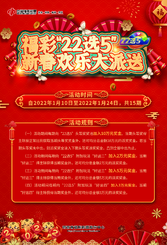 福彩“22选5”新春欢乐大派送 活动时间 自2022年1月10日至2022年1月24日,共15期 活动规则 (一)活动期间每期向“22选5”头等奖奖池加入10万元奖金。当期头等奖得主除按正常比例获取当期头等奖奖金外,还可均分总金 ...