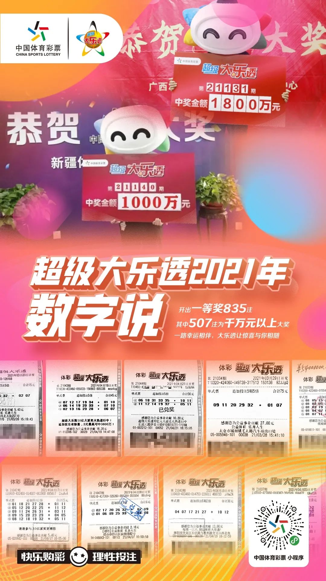 2021年超级大乐透通过450.78亿元销量筹集彩票公益金162.28亿元开出一等奖835注其中507注千万元以上大奖两注亿元大奖超4100万人次分享了10亿元派奖奖金 ...