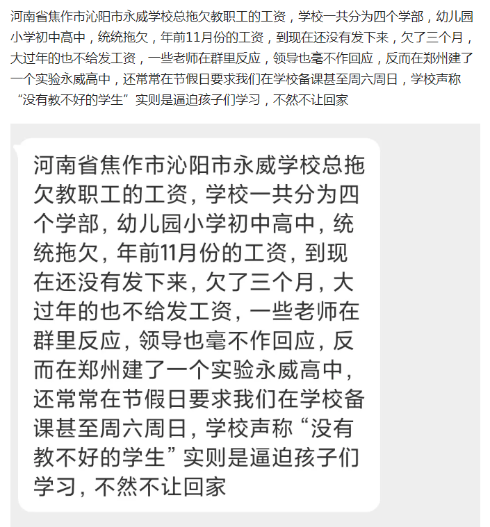 河南省焦作市沁阳市永威学校总拖欠教职工的工资,学校一共分为四个学部,幼儿园小学初中高中,统统拖欠,年前11月份的工资,到现在还没有发下来,欠了三个月,大过年的也不给发工资,一些老师在群里反应,领导也毫不 ...