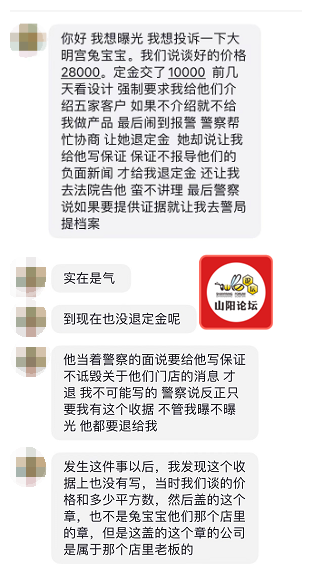 焦作大明宫兔宝宝全屋定制被投诉:给客户做产品闹到客户要报警?不曝负面消息才给退定金?报了警现在还不给退定金?做生意怎能如此“蛮横”!? 做生意本是以和为贵,兔宝宝全屋定制为何要如此刁难客户呢?而大明 ...