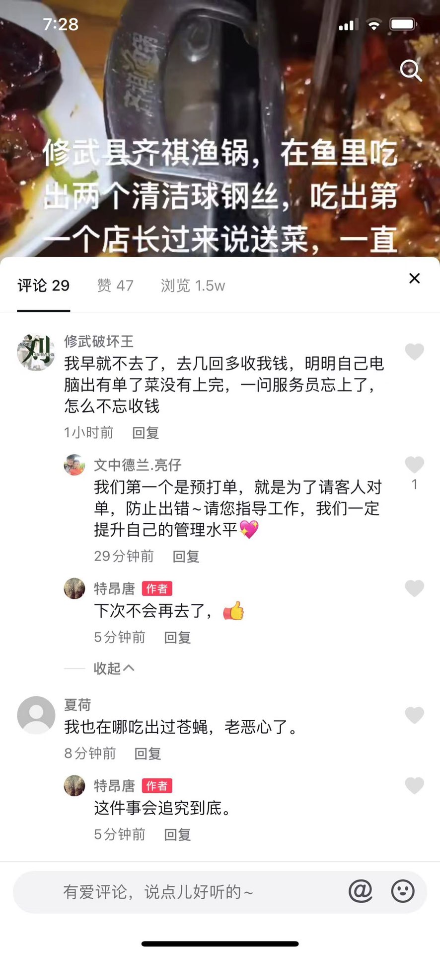 一晚上两桌吃出3根钢丝球,修武县齐祺渔锅卫生堪忧! 2022年2月26日晚上,消费者唐先生在修武县云台大道齐祺渔锅吃饭,第一次叨出番茄后发现里面有个5厘米长的钢丝球,把店长叫过来的时候,店长说理解一下,饭店避 ...