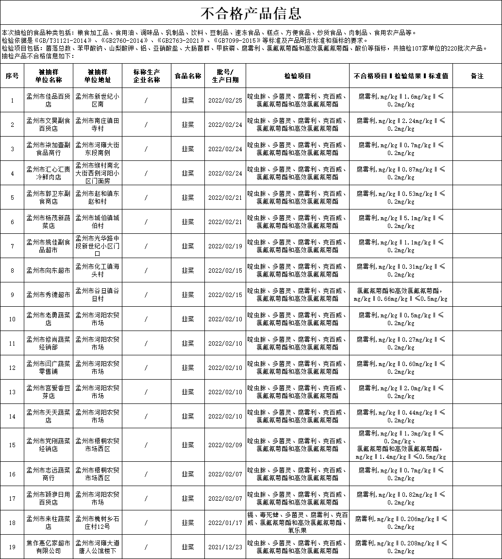 孟州市市场监管局 食品安全监督抽检信息通告(2022年第1期) 近期,孟州市市场监督管理局组织抽检的食品种类包括:粮食加工品、食用油、调味品、乳制品、饮料、豆制品、速冻食品、糕点、方便食品、炒货食品、肉制品、食 ...