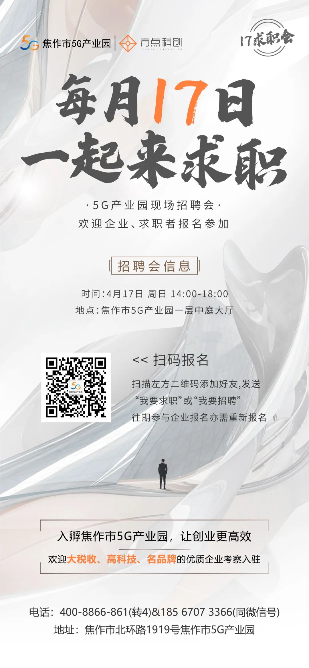 17求职会 是焦作市5G产业园主办的全年定期招聘会,园区于每月17日为企业与求职者搭建双向互通的平台,将为企业发展、拉动区域就业提供源源不断的动力。 4月17日「17求职会」即将开启欢迎企业及求职者扫码报名(备注 ...
