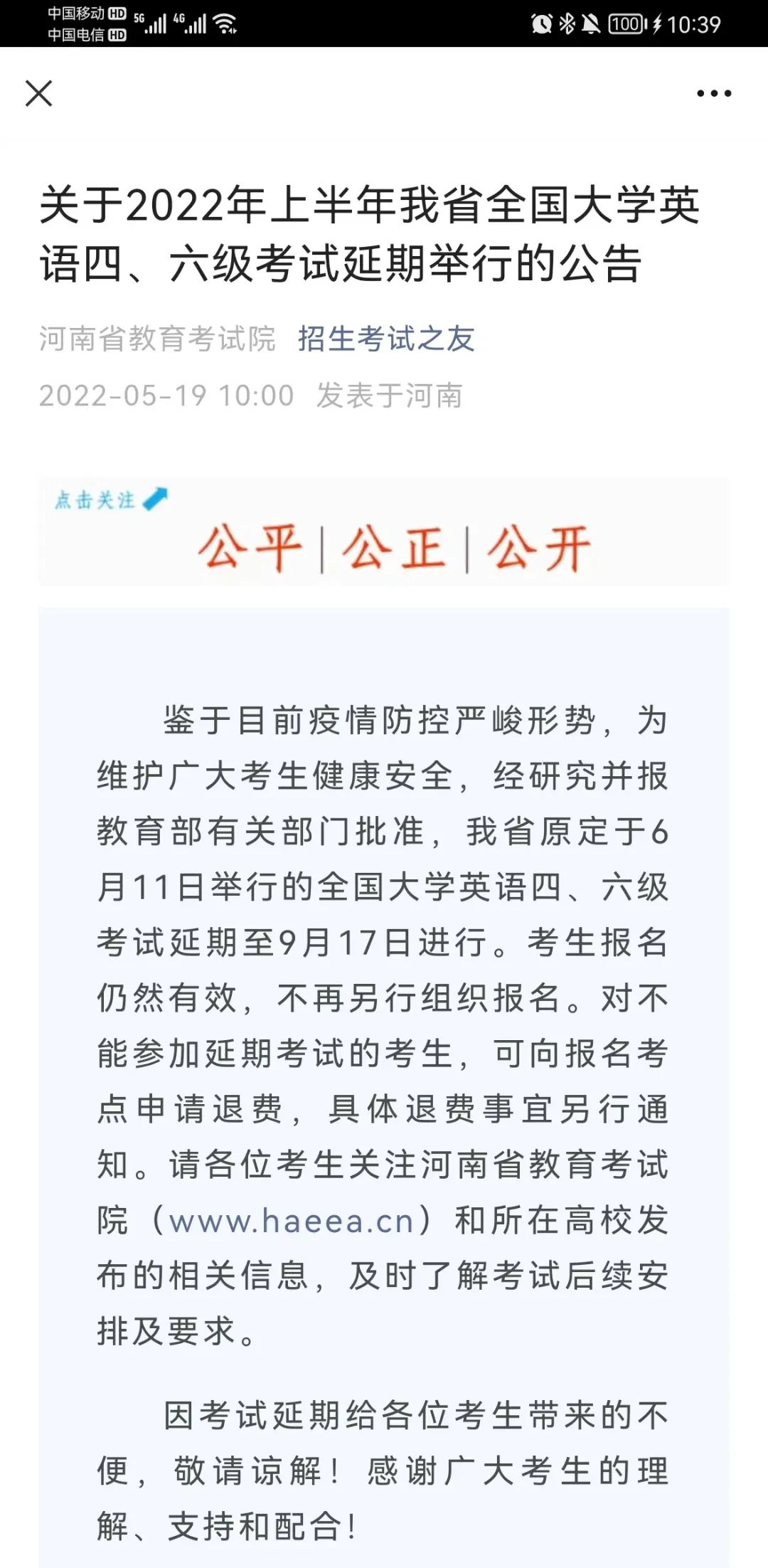 记者从河南省教育考试院了解到,鉴于目前疫情防控严峻形势,为维护广大考生健康安全,经研究并报教育部有关部门批准,河南省原定于6月11日举行的全国大学英语四、六级考试延期至9月17日进行。考生报名仍然有效,不再 ...