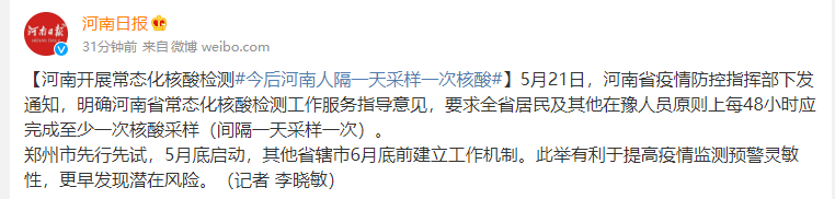 5月21日,河南省疫情防控指挥部下发通知,明确河南省常态化核酸检测工作服务指导意见,要求全省居民及其他在豫人员原则上每48小时应完成至少一次核酸采样(间隔一天采样一次)。 来源:河南日报 ...