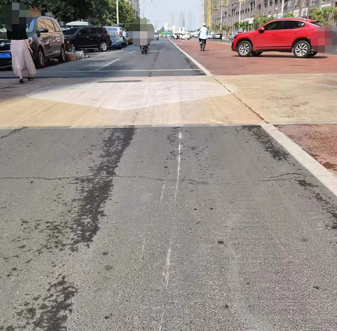 骑车带孩子经过时不慎滑倒,摔得是鼻青脸肿的,胳膊也摔烂了,惊动110都来了,希望有关部门能够予以关注,消除此路段潜在的交通安全隐患! 其实到现在,也不知道这片红色区域到底是干嘛的,能看到就是中间停放着 ...