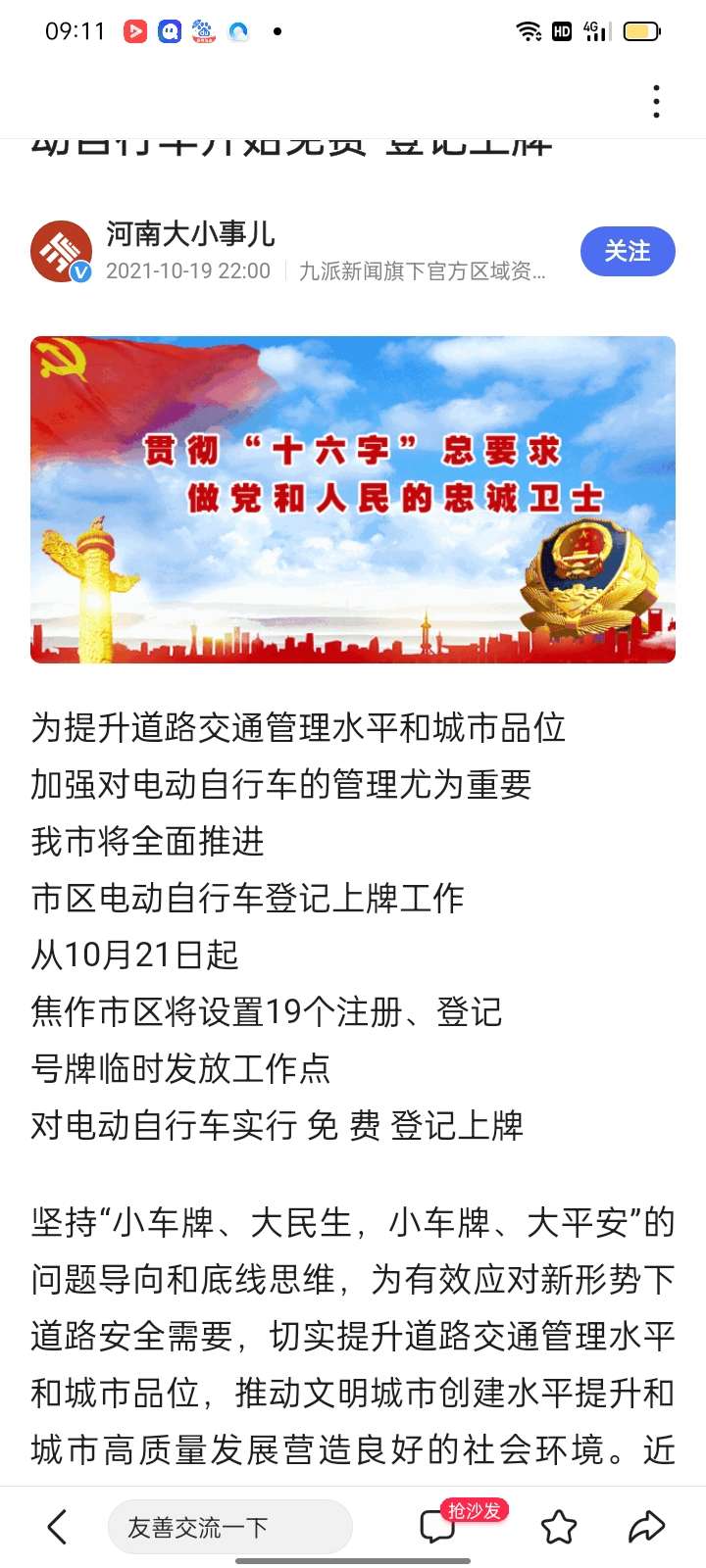 前一阵子焦作日报说了免费给电动车上牌照,说的有鼻子有眼的,结果是让老百姓空欢喜一场,放个鸽子玩玩,现在某些人来村里给电动车上牌照收费,割老百姓韭菜,希望政府部门有关部门出来解释解释。 ...