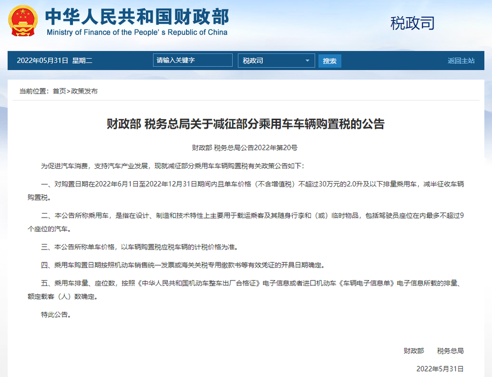 5月31日,财政部官网发布《关于减征部分乘用车车辆购置税的公告》,为促进汽车消费,支持汽车产业发展,现就减征部分乘用车车辆购置税有关政策进行公告。 公告全文如下: 财政部 税务总局关于减征部分乘用车车辆 ...
