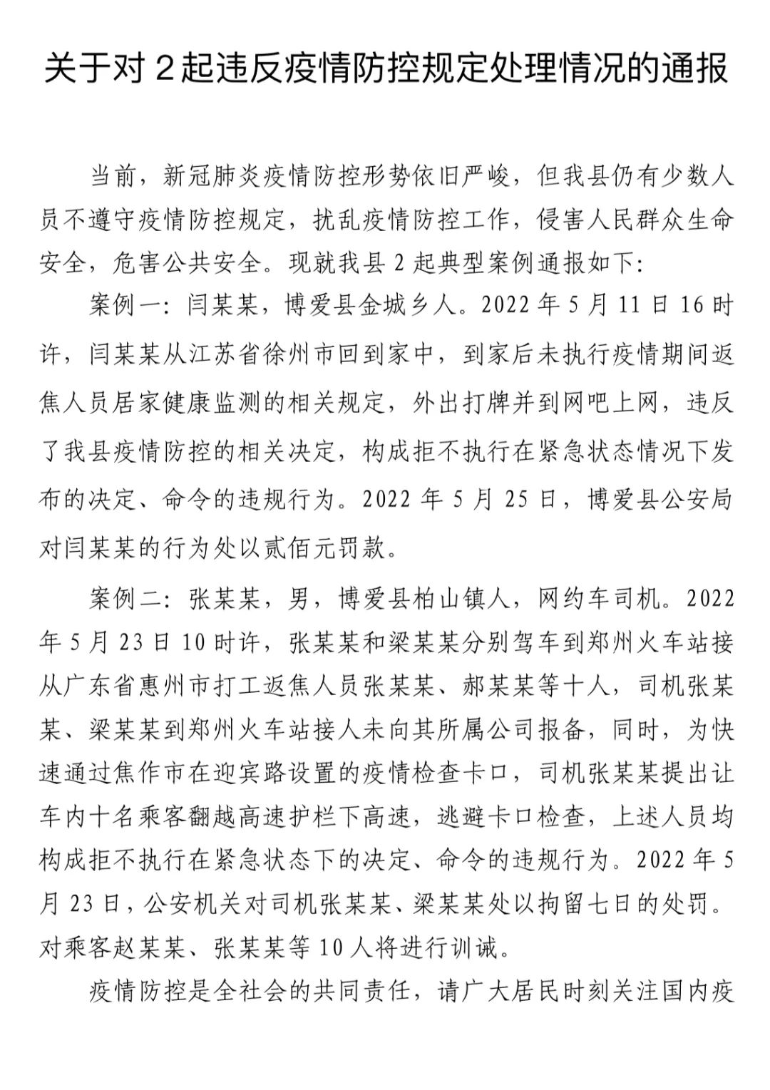 最新通报!违反防疫规定焦作博爱多人被处罚! ...