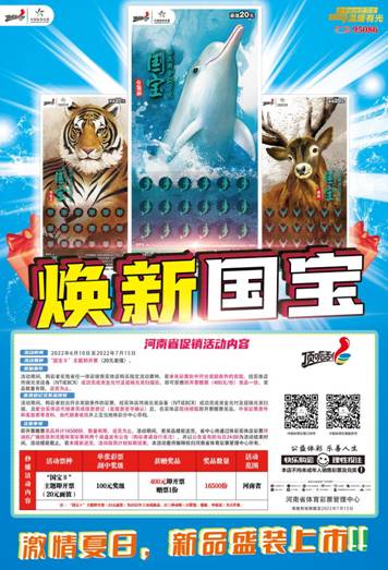 尊享万份“豪礼”! 体彩“国宝Ⅱ”带你激情一夏! 温馨提示——关于活动细则 1.特别提示:“国宝Ⅱ”主题即开票(20元面值)为2022年上市的新品,以三种动物(白鱀豚、麋鹿、华南虎)为主形象。 2.其它详情见 ...
