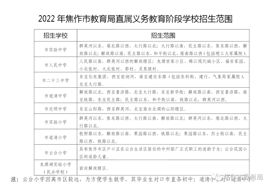 2022年焦作市直和五城区义务教育阶段学校的招生范围已经划定! 市教育局直属学校 (点击图片可放大查看)