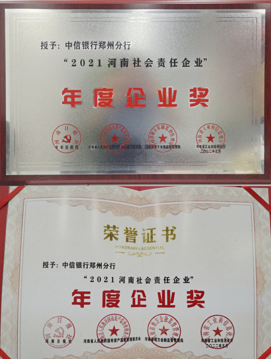 为充分展示河南企业2021年在全面推进高质量、投身乡村振兴、践行社会责任等方面的成就,7月2日,“2021河南社会责任企业”颁奖典礼在郑州隆重举行。中信银行郑州分行荣获“2021河南社会责任企业”荣誉称号,成为12家 ...