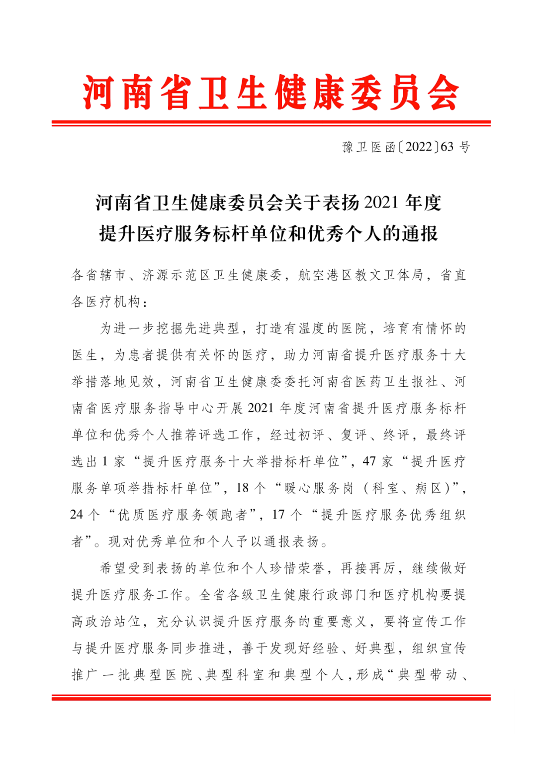 本帖最后由 拽老猫 于 2022-7-7 15:01 编辑 喜迎建党101周年之际,河南省卫健委发文表扬“2021年度提升医疗服务标杆单位和先进个人”,我院于拥军院长荣获“优质医疗服务领跑者”殊荣,我院获得“提升医疗服务单 ...