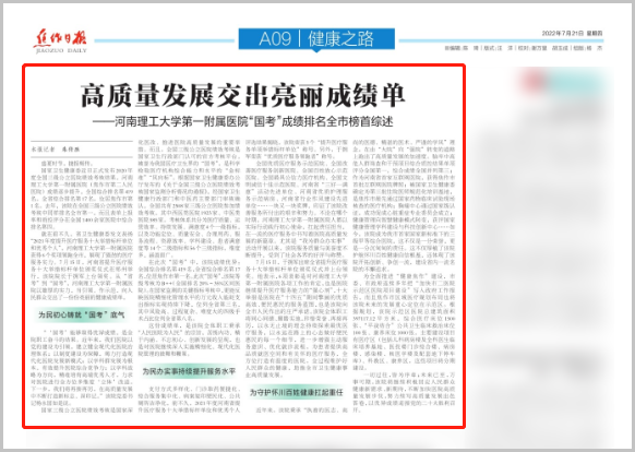 7月21日,《焦作日报》刊登我院报道:高质量发展交出亮丽成绩单——河南理工大学第一附属医院“国考”成绩排名全市榜首综述!
