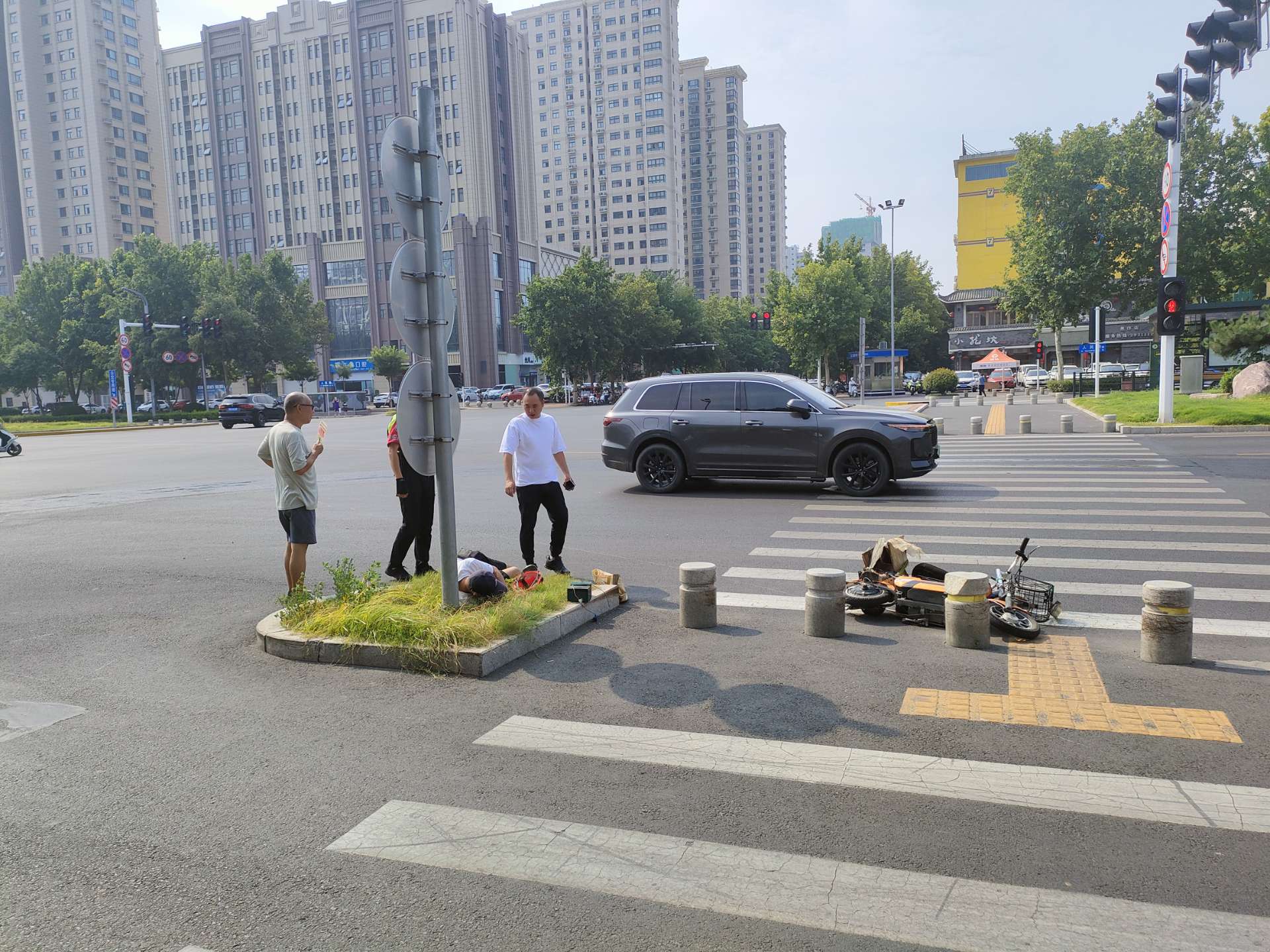 刚才在焦作市人民路与政二街交叉口发生车祸,一外卖小哥倒在了地上,估计是闯红灯了,还是得安全第一。