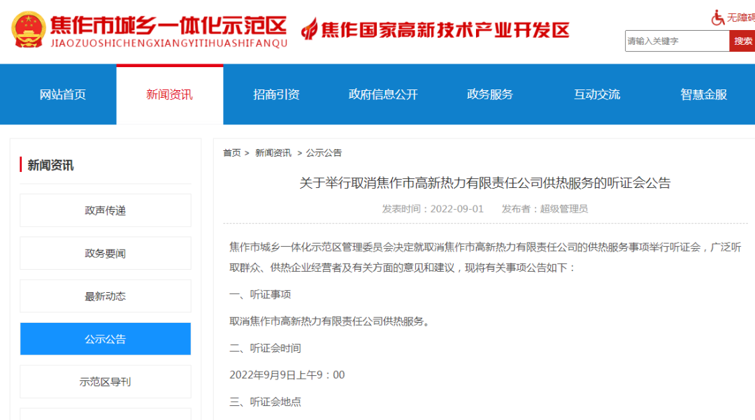 焦作人注意!9月9日焦作示范区将召开听证会 关于取消焦作市高新热力有限责任公司供热服务 关于举行取消焦作市高新热力有限责任公司供热服务的听证会公告 焦作市城乡一体化示范区管理委员会决定就取消焦作市高新热 ...