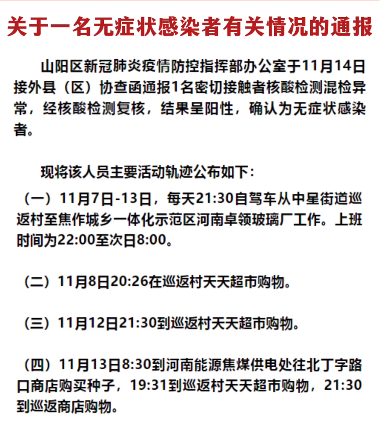 紧急!山阳区公布一例无症状感染者活动轨迹!