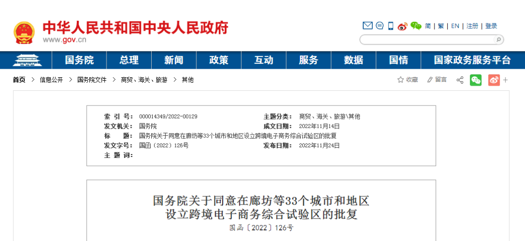 11月24日中国政府网发布《国务院关于同意在廊坊等33个城市和地区设立跨境电子商务综合试验区的批复》河南焦作市、许昌市两地上榜,来看具体文件: 国务院关于同意在廊坊等33个城市和地区设立跨境电子商务综合试 ...