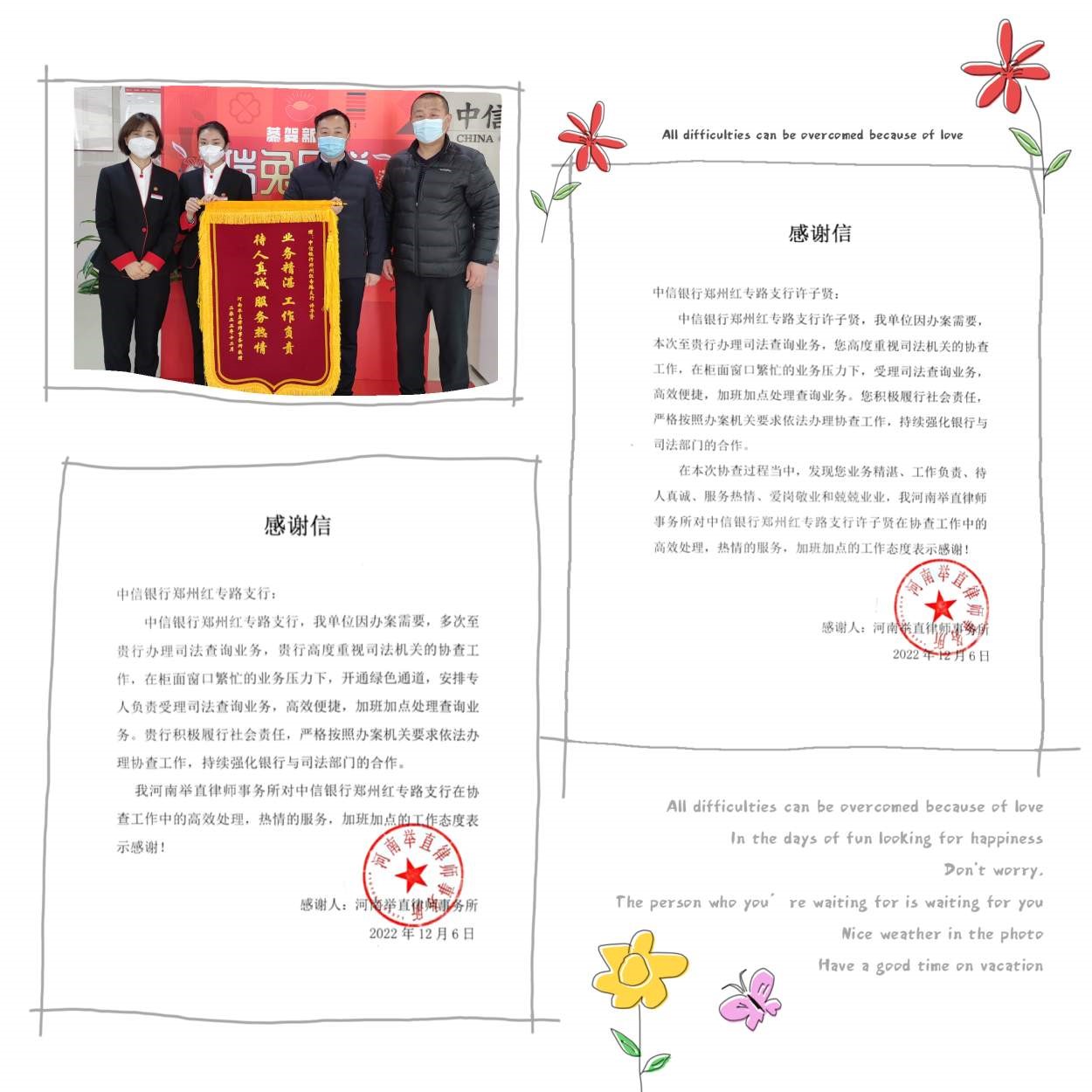 近日,中信银行郑州分行收到某律师事务所送来的一面锦旗以及两封表扬信,热情表扬了该行工作人员在司法协查工作中的付出与担当。该律师事务所的相关负责人表示,他们受理了一起十几年前的案件,在好几家银行都进行了 ...