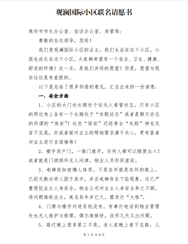焦作观澜国际小区业主联名维权请愿!