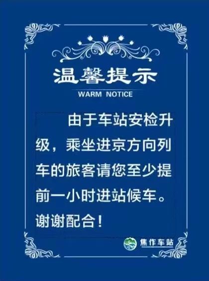 乘坐进京列车的小伙伴们注意了! 焦作火车站实施二次安检了! 小编提醒大家 由于“二次安检”需要较长时间请提前1至2小时到达车站 请提前1至2小时到达车站请提前1至2小时到达车站以免耽误行程 扩散!周知! ...