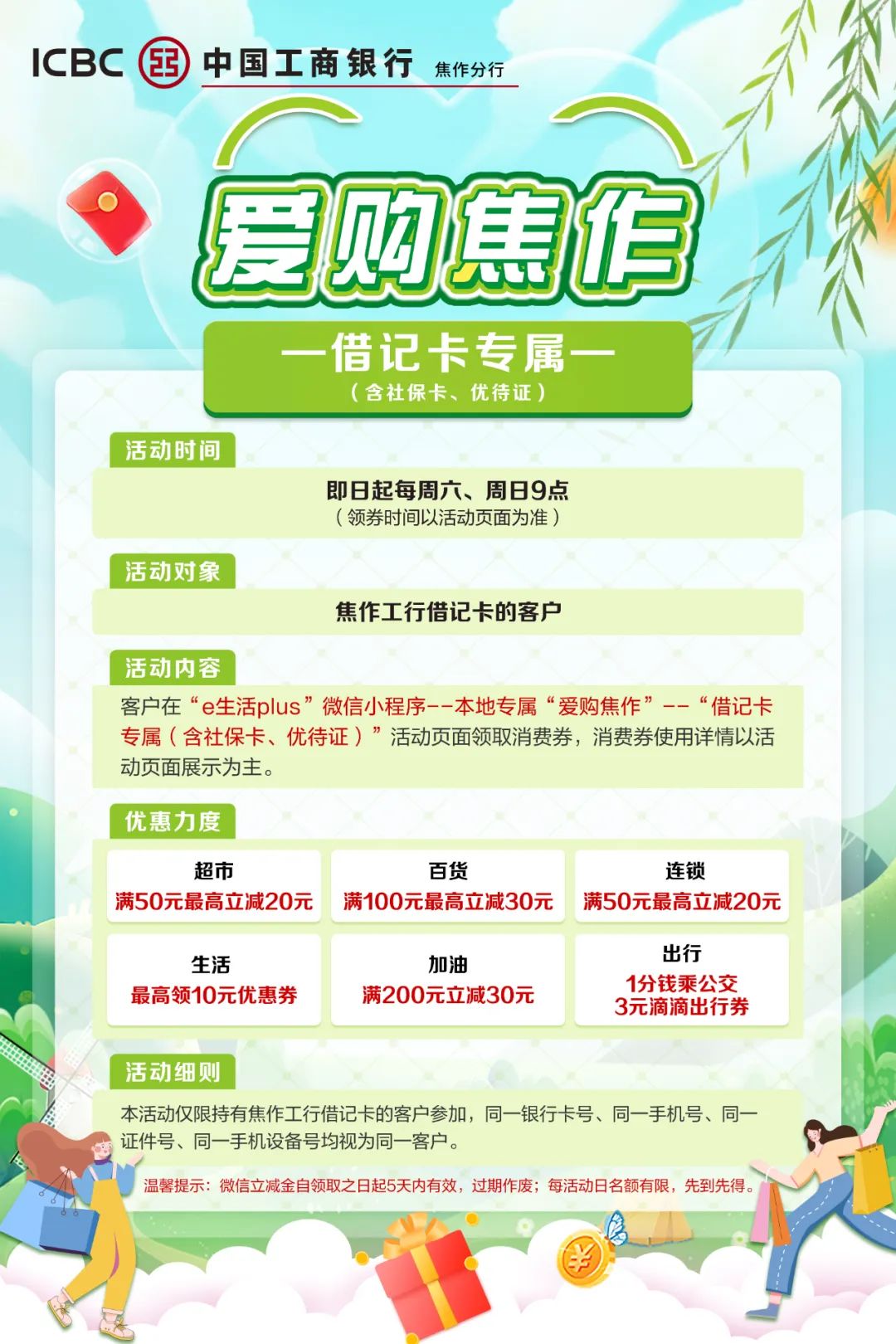 爱 购 焦 作 活动时间: 即日起每周六、周日9点(领券时间以活动页面为准) 活动对象: 焦作工行借记卡客户(含社保卡、优待证) 活动规则: 客户在“e生活plus”微信小程序--本地专属“爱购焦作”--“借记卡专属( ...