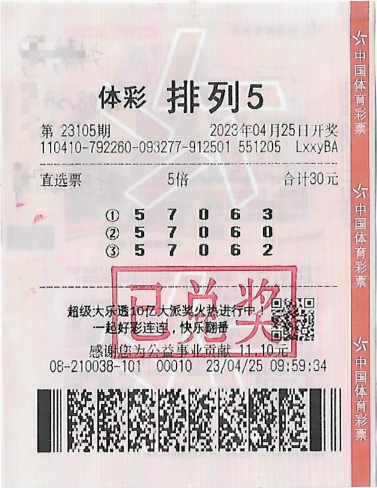 2023年4月25日,中国体育彩票排列5第23105期开奖号码为5 7 0 6 3,修武县4108210038实体店一购彩者一张直选票中出5倍排列5一等奖,中得奖金50万元。 据悉,这位购彩者已经购买体育彩票五年之久,一直喜欢购买大 ...
