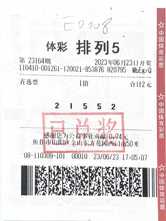 体彩排列5第23164期开奖,开奖号码为“2、1、5、5、2”,在位于焦作市山阳区金山东方花园西门南50米的4108110309体彩实体店传来喜讯,购彩者王先生凭借一张2元直选票收获1注一等奖,获得奖金10万元。 据实体店代 ...
