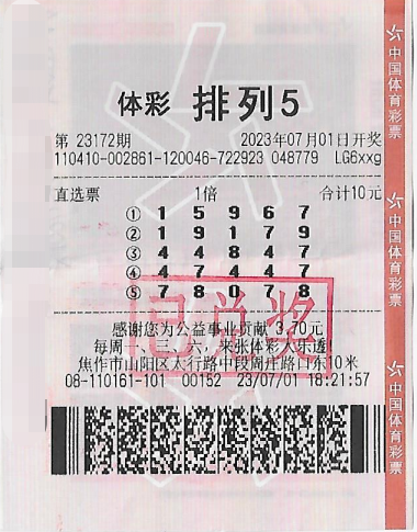 体彩排列5又为焦作市民送来大奖惊喜啦!7月1日晚,体彩排列5第23172期开奖,位于焦作市山阳区太行路中段周庄路口附近的4108110161体彩实体店传来好消息,该店一名幸运购彩者凭借一张直选票喜中1注一等奖,收获奖金10 ...