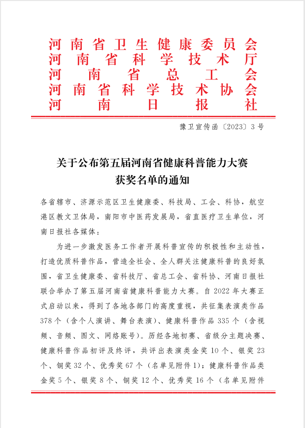 近日,在河南省卫生健康委、河南省科技厅、河南省总工会、河南省科协与河南日报社联合主办,河南省疾病预防控制中心、大河健康报社联合承办的第五届河南省健康科普能力大赛上,焦作市人民医院健康促进办护士长刘学 ...