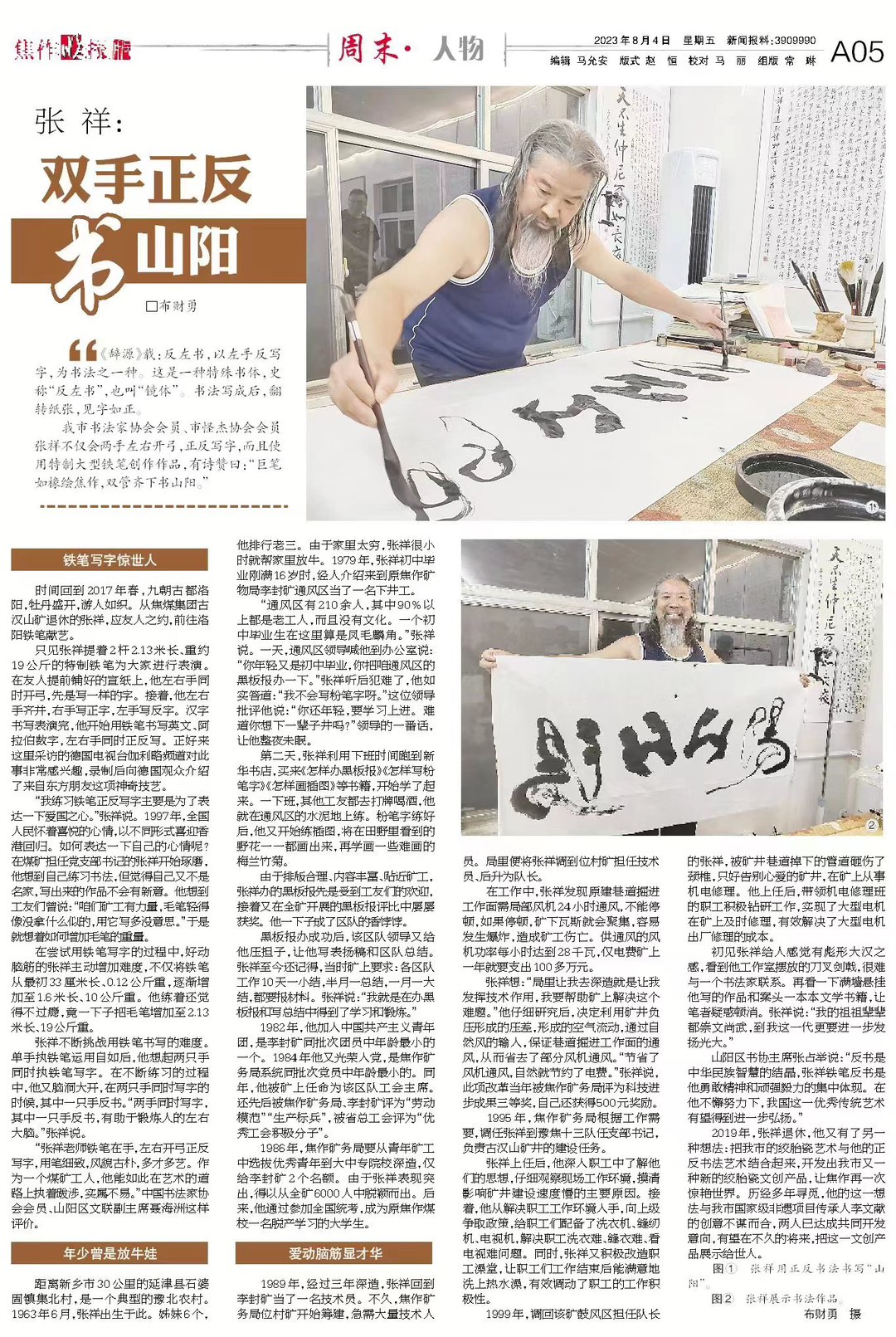 焦作晚报 2023.8.4《张祥:双手正反书山阳》作者:布财勇 《辞源》载:反左书,以左手反写字,为书法之一种。这是一种特殊书体,史称“反左书”,也叫“镜体”。书法写成后,翻转纸张,见字如正。 我市书法家协会会 ...