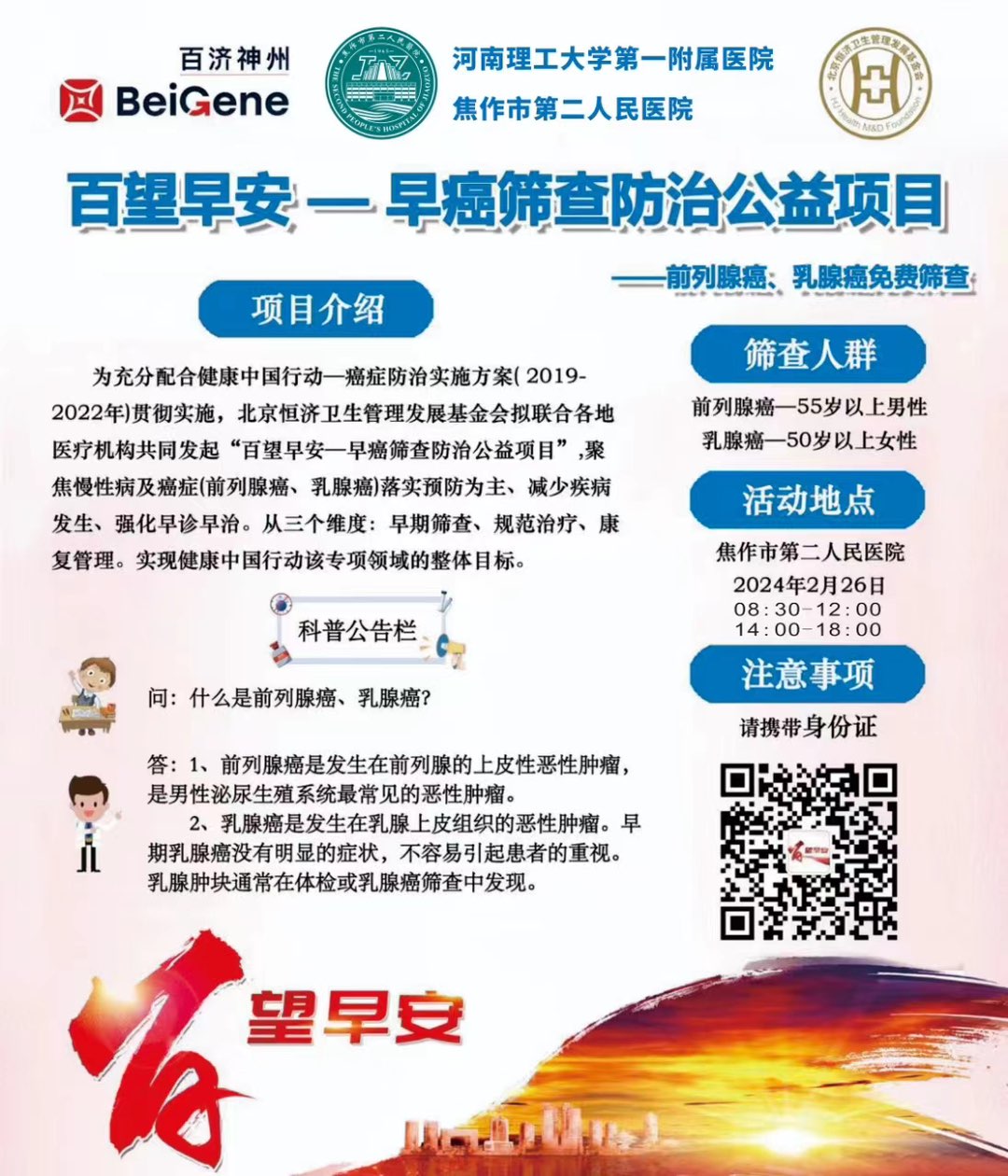 百望早望——早癌筛查防治公益项目! 为充分配合健康中国行动——癌症防治实施方案( 2019-2022年)贯彻实施,北京恒济卫生管理发展基金会拟联合各地医疗机构共同发起“百望早安——早癌筛查防治公益项目” ,聚焦慢性 ...