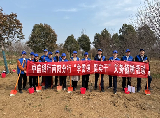 中信银行南阳分行组织开展“学雷锋 促实干”青年志愿者植树活动 为践行雷锋精神,守护“绿水青山”,3月12日,中信银行南阳分行组织开展“学雷锋 促实干”义务植树青年志愿活动。 不负好春光,为大地增添新绿。活 ...