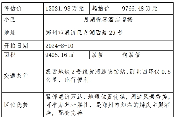 中信银行郑州分行拍卖处置抵押酒店 中信银行郑州分行在法院申请执行河南某公司过程中,查封了抵押人名下位于郑州市惠济区月湖西路29号的酒店一座。郑州高新技术产业开发区人民法院将于2024年8月10日10时起至2024年8 ...