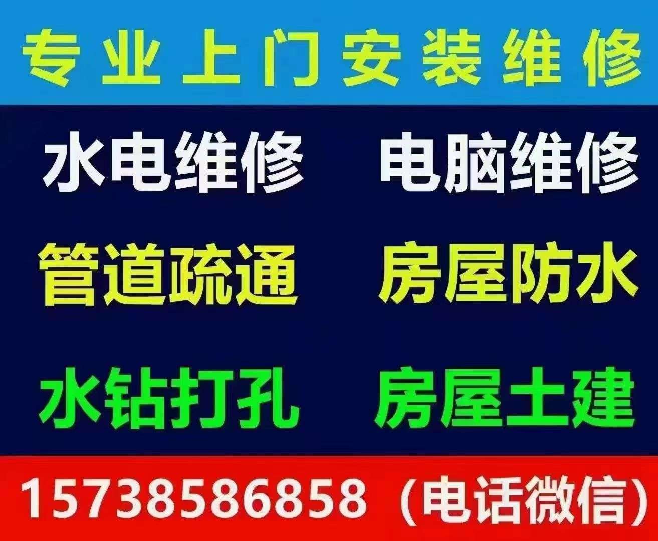水,电,灯,卫浴,电脑。空调,疏通,防水,打孔,拆除清运,各种安装维修,欢迎来电15738586858(电话/微信)