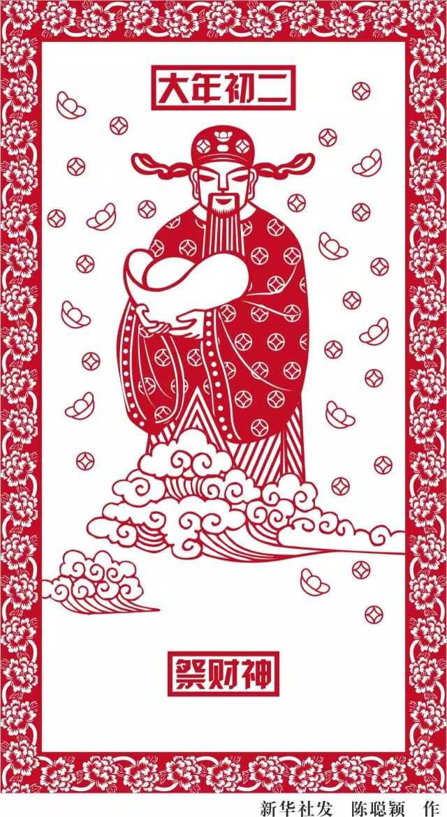 北方在正月初二祭财神,这天无论是商贸店铺,还是普通家庭,都要举行祭财神活动。各家把除夕夜接来的财神祭祀一番。实际上是把买来的粗糙印刷品焚化了事。这天中午要吃馄饨,俗称"元宝汤"。