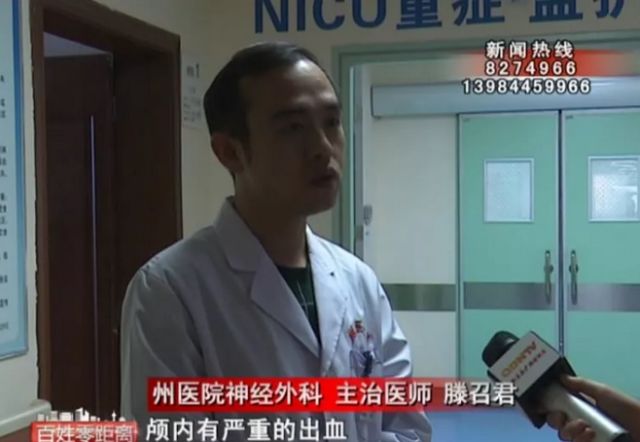 由于巨大的冲击力,陈忠平在接住小孩的时候导致自己的前胸壁受伤,加上向后仰摔倒的过程中,后枕部着地导致颅内严重损伤,送到医院时已经处于昏迷状态了。黔东南州医院神经外科主治医师滕召君:“陈忠平的病情是相当严重的,她颅内有严重的出血,我们把她送进了重症监护室,通过一天的积极治疗和抢救,病情稍有好转,现在意识也有所恢复。”