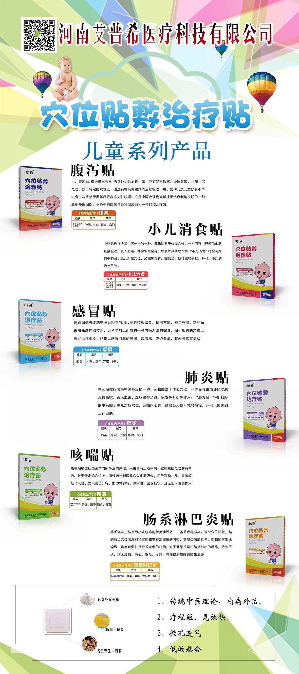 河南艾普希医疗科技有限公司主营:儿童穴位贴(腹泻、小儿消食、感冒、肺炎、咳喘、肠系淋巴炎),暖宫贴、痛经贴、磁疗热帖等。主要销售范围:医院,连锁大药房,乡镇卫生院,私人诊所,小儿推拿馆及母婴馆 现诚招 ...