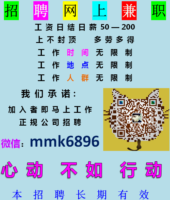 本工作没时间和地点的限制,操作简单,人人适合, 收入和时间是掌握在自己的手里的,多一份了解,多一次机会!咨询微信:mmk6896本招聘长期有效 ...