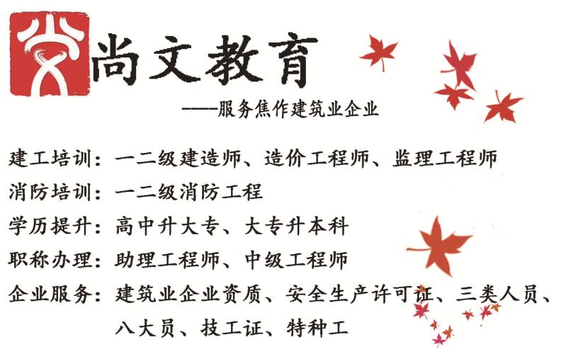 尚文教育——服务焦作建筑业企业建工培训:一二级建造师、造价工程师、监理工程师消防培训:一二级消防工程师 学历提升:高中升大专、大专升本科职称办理:助理工程师企业服务:建筑业企业资质、安全生产许可证、 ...