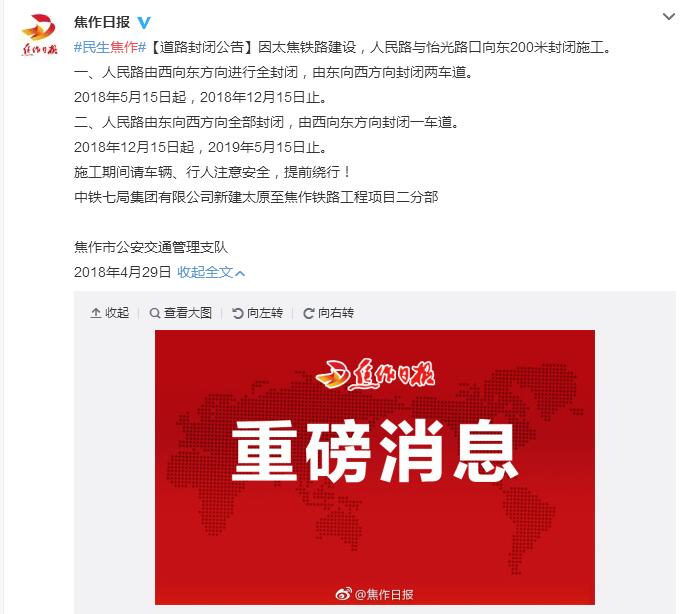 因太焦铁路建设,人民路与怡光路口向东200米封闭施工。 一、人民路由西向东方向进行全封闭,由东向西方向封闭两车道。 2018年5月15日起,2018年12月15日止。 二、人民路由东向西方向全部封闭,由西向东方向封闭一车道。 2018年12月15日起,2019年5月15日止。 施工期间请车辆、行人注意安全,提前绕行! 中铁七局集团有限公司新建太原至焦作铁路工程项目二分部 焦作市公安交通管理支队 2018年4月29日 |
