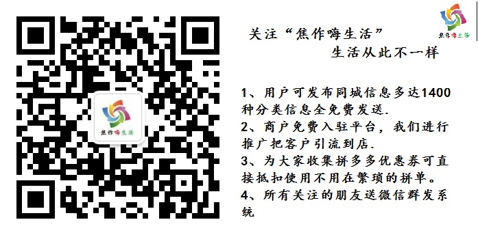欢迎关注我们--焦作首家本地同城商圈及拼多多优惠系统,打造焦作最便民生活服务站,为本地商家解决品牌推广及优惠活动发布,为用户提供吃喝玩乐购等优惠信息。 我们的优势: 1:所有商家免费入驻,免费发布商品优惠 ...