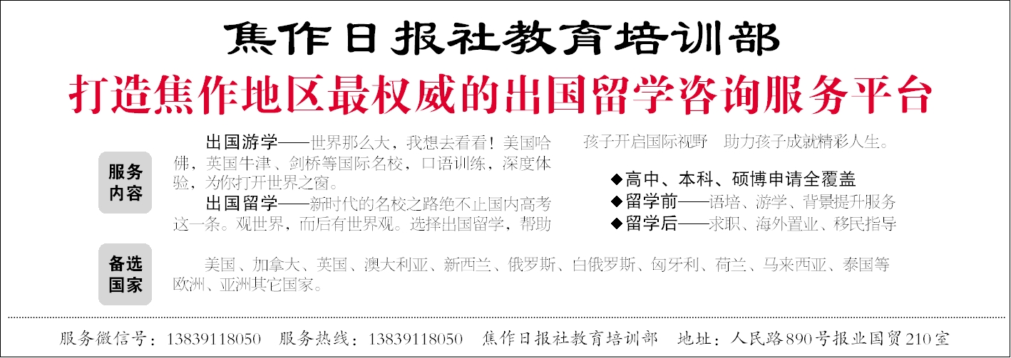 开启国际视野 成就精彩人生 焦作日报社教育培训部开通出国留学咨询服务平台 本报讯(记者徐金华)每年4月至7月是高考学生一生至关重要的节点,如何选择升学路成为众多考生和家长关注的问题。即日起,本报教育培训部 ...