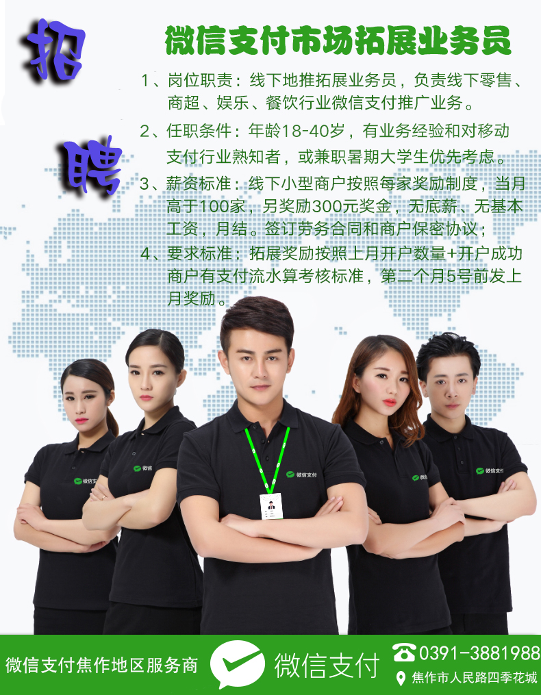 1、岗位职责:线下地推拓展业务员,负责下线零售、商超、娱乐、餐饮微信支付推广业务。2、任职条件:年龄18-40岁,有业务经验和对移动支付行业熟知,或兼职暑期大学生优先考虑。 3、薪资标准:线下小型商户按照每家 ...