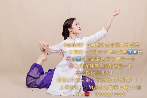 《禅韵阁》舞韵成品舞学员招募 一支舞蹈一个月六个课时仅需99元 前3期特惠赠送茶艺课程一节 连报两期赠送插花课程一节 每期仅限四人!!! 报名以付款为准,不接受口头预定!!! 上课地址:王府井小公寓楼15楼201室 ...